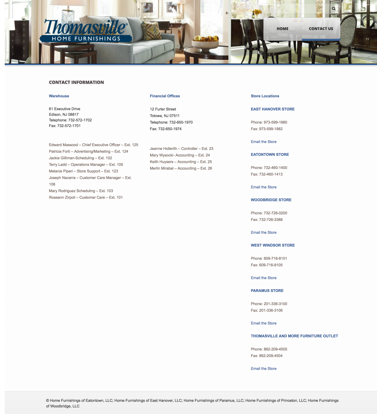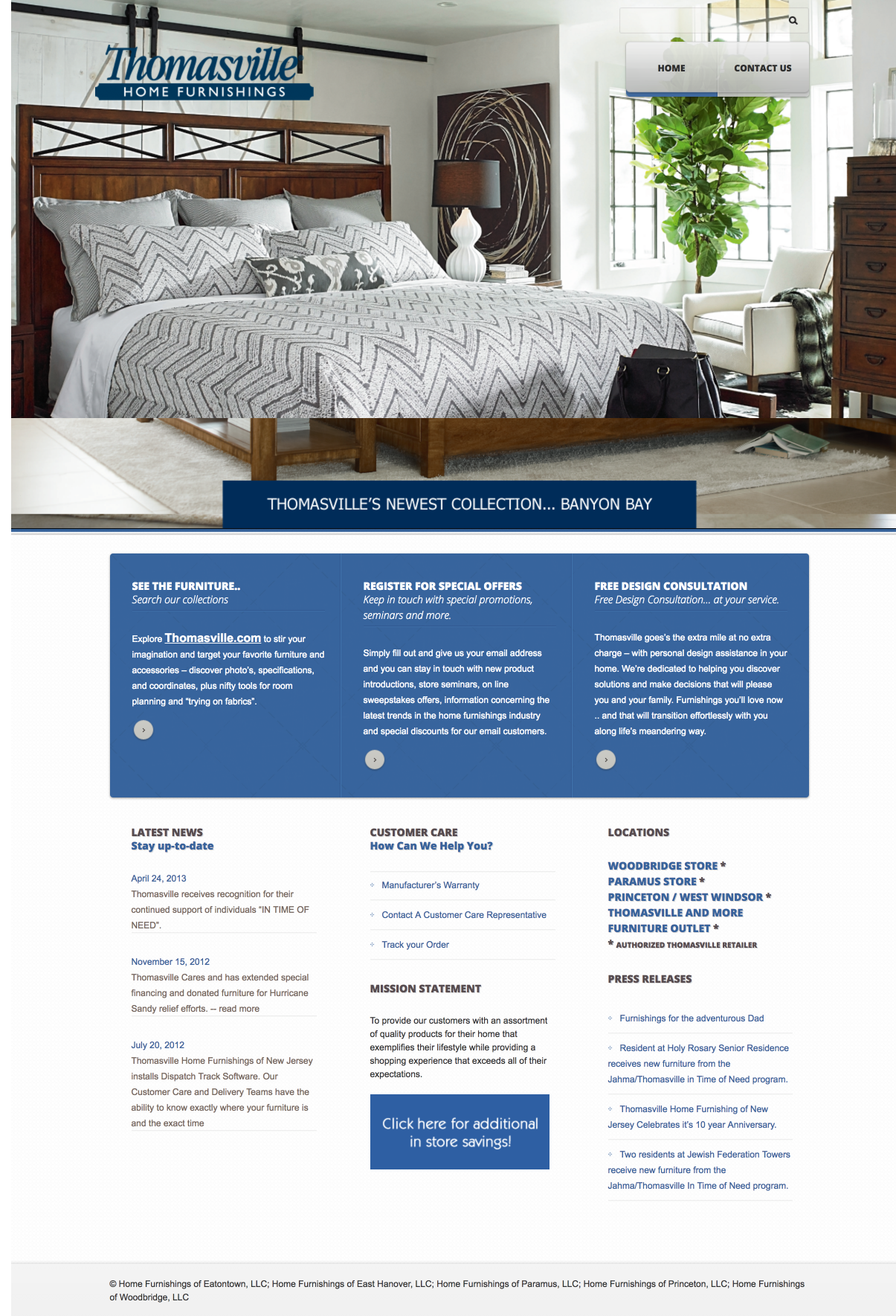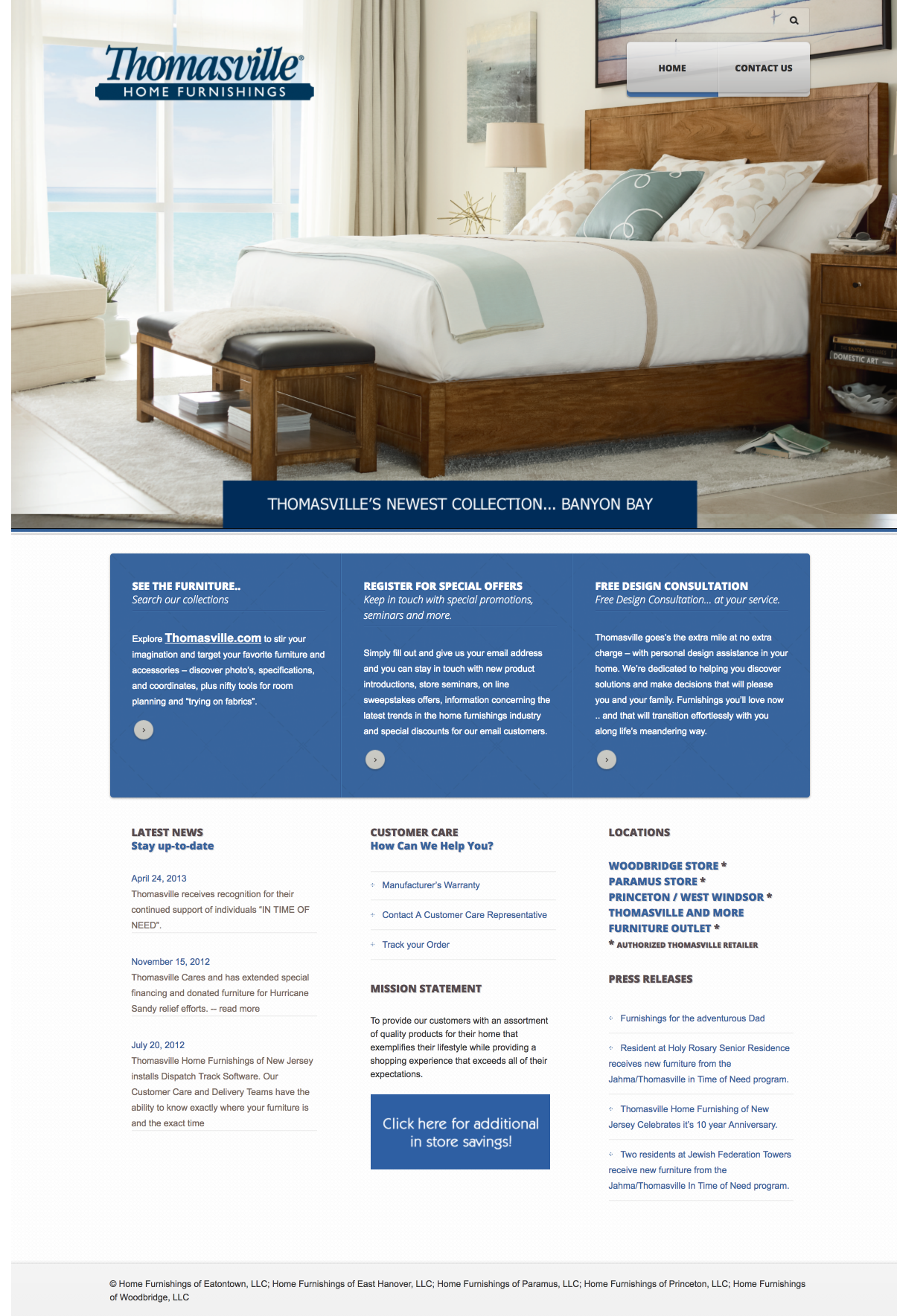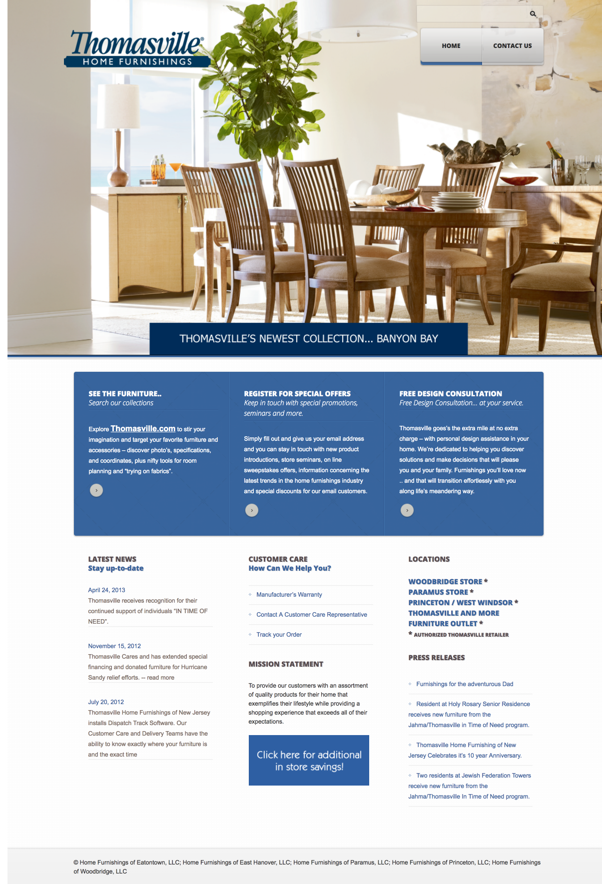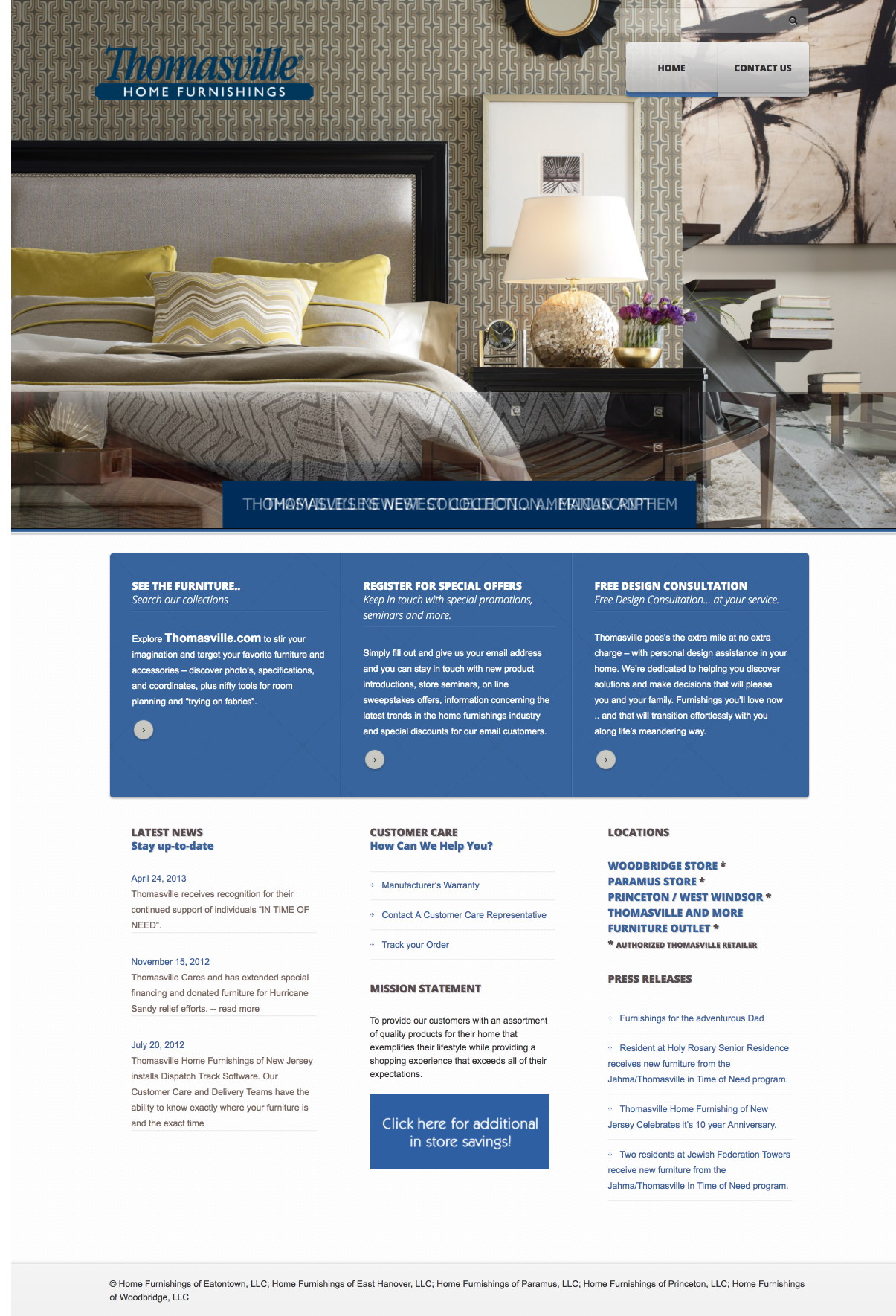 I have a long personal relationship with Thomasville Home Furnishings, both at the corporate headquarters in Thomasville, NC and their retail chain in New Jersey, owned by industry veteran Edward Massood. my contributions have included direct brochures, display ads and web design and maintenance. I appreciate their business.